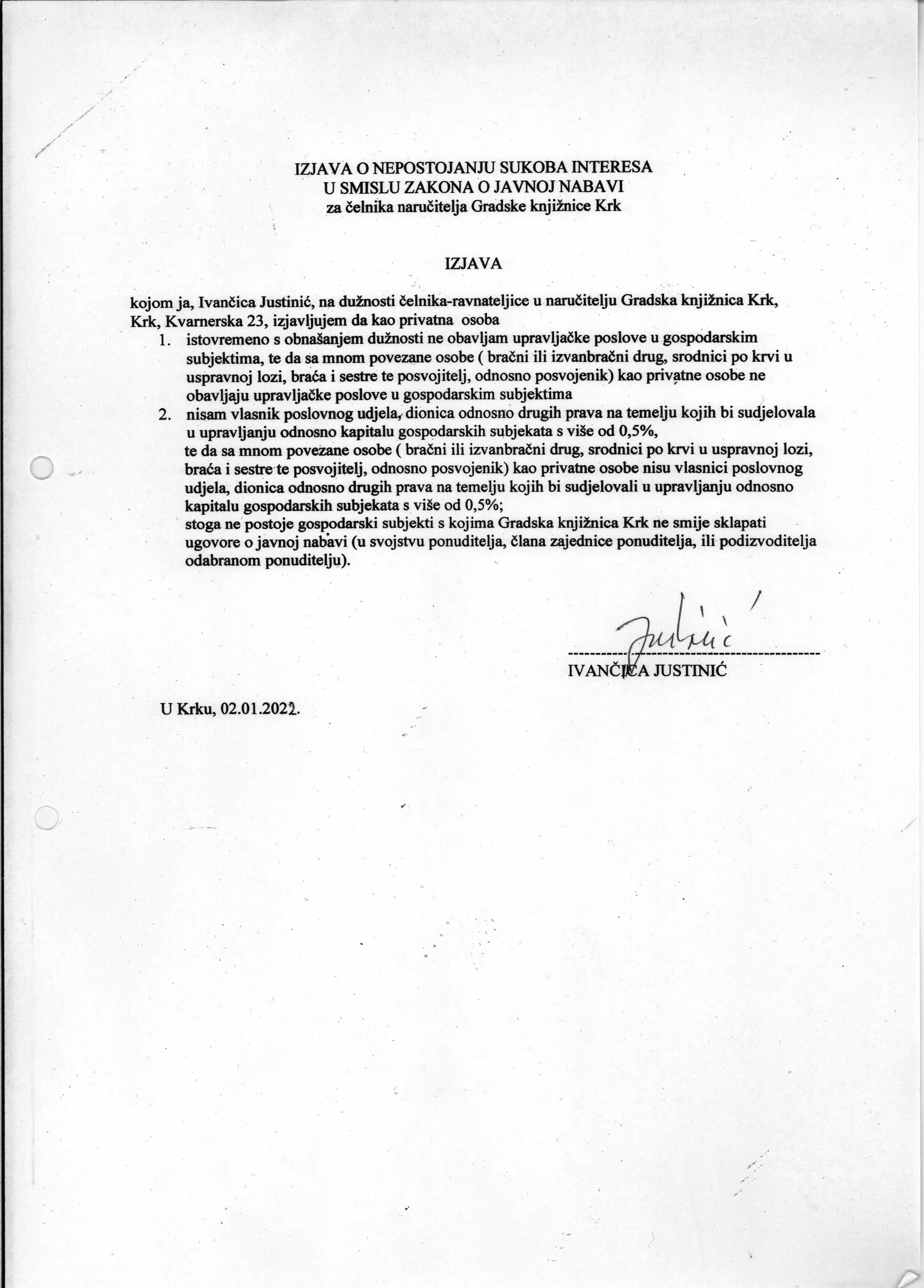 Izjava o nepostojanju sukoba interesa Ivančica Justinić (datum objave: 24.01.2022.)